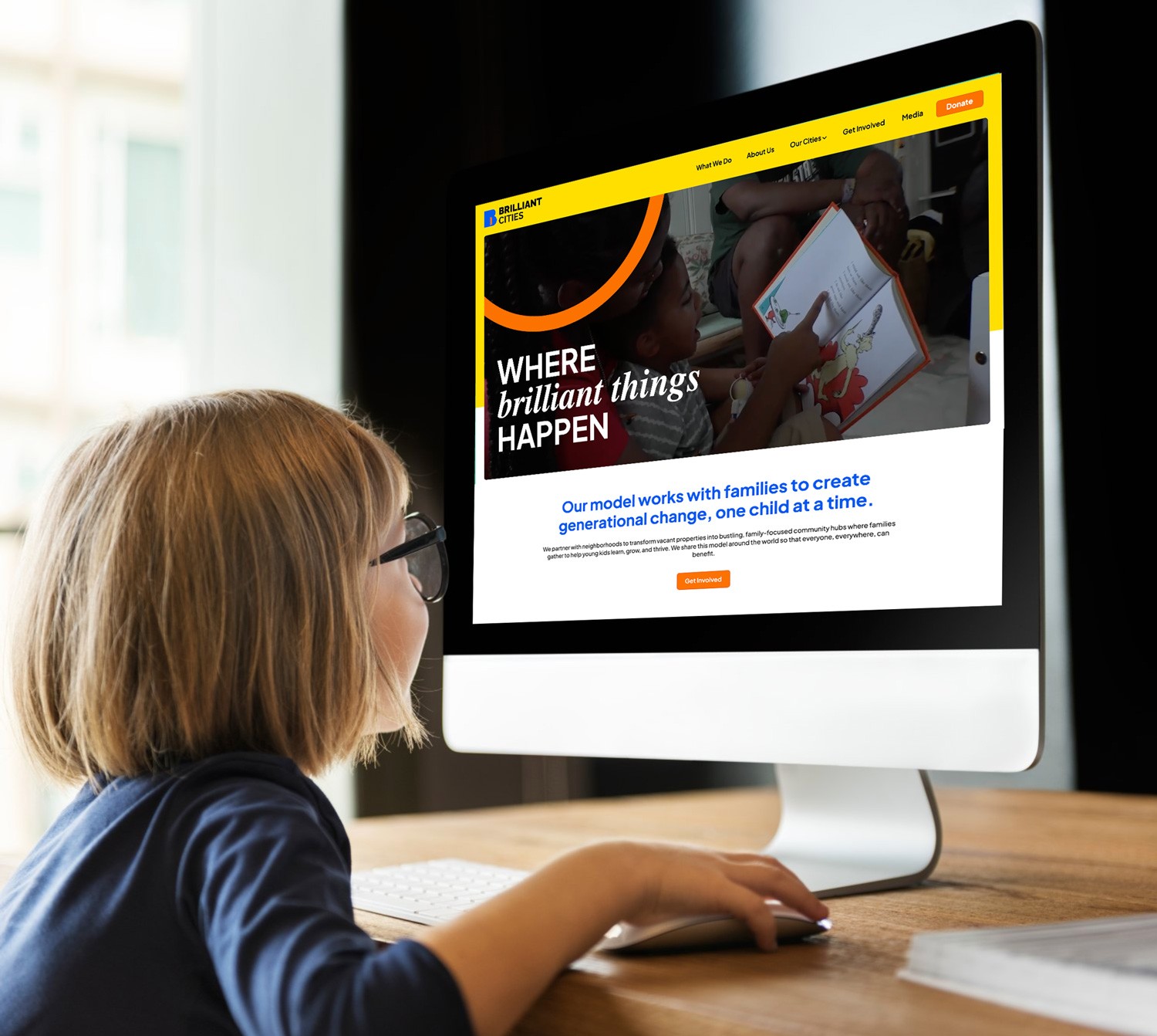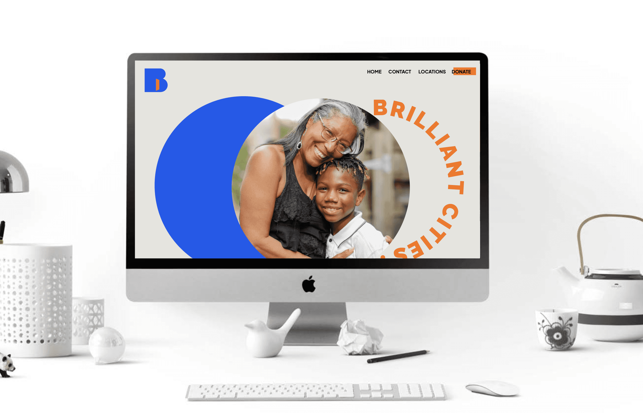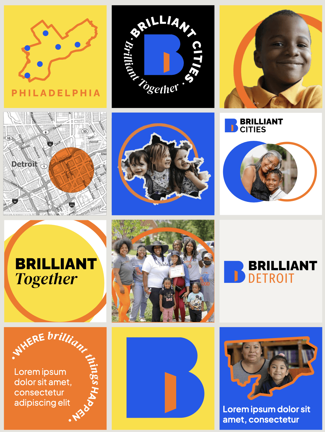 From the beginning, we wanted the Brilliant Cities brand to be vibrant, joyful and accessible. A visual identity that could reflect their communities and work whilst being bold and unignorable, so when it was brought to the attention of other city and community leaders, they were left feeling inspired, wanting to know more. The existing palette was tweaked: the orange more vibrant, the blue more saturated and introducing a sunny yellow. The fonts were kept simple, rounded and friendly. The circles became the mechanism to hold imagery, messaging, denote a place, highlight people or a moment. They can be used in a myriad of combinations and colours, to reflect the diversity of each neighbourhood. The icon – a bold B contains an open orange door – the symbol of the hub and ethos of the organisation. It’s an invitation to come in and take a seat, connect with people in your neighbourhood and get supported. Each city has its own unique font (Brilliant Detroit, Brilliant Philadelphia, Brilliant Cleveland, etc.), so they can have their own sub-identity. This was important as each execution of the model will vary from city to city, and we wanted to offer a little something different for each one.