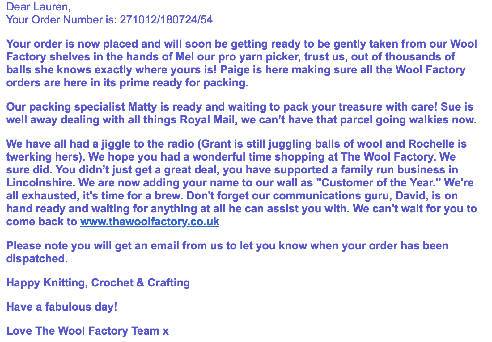 This was completely unnecessary – where a standard confirmation would do the job, this goes above any beyond to add an element of joy, reinforcing what this brand is about and a great brand touchpoint for their customers. It’s a simple, FREE, thing to create and they haven’t wasted the opportunity and really thought about it. Yes, I know this is an automated response but I FEEL like it’s deeply personal.